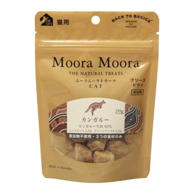 ムーラムーラトリーツ キャット カンガルー 20g 1100%オーストラリア産の健康食材をフリーズドライにしたおやつです。非加熱加工のため素材の栄養と風味がそのまま! ◎非加熱のフリーズドライ製法で、素材の栄養と風味を損なわずにとじこめたおやつ。 ◎記載の原材料以外は一切使用していません。 ◎非常に栄養価が高いため、手作り食のトッピングにもご使用いただけます。 ◎カンガルーは体に優しい赤身の健康食肉で、低脂肪、高タンパク、低コレステロールのお肉です。 原材料 カンガルー生肉95%、レッドビート2.5%、グリーンアップル2.5% 原産国 オーストラリア 成分 たんぱく質:65.0%以上、脂質:7.0%以上、粗繊維:3.6%以下、灰分:8.7%以下、水分:8.0%以下 代謝カロリー:407kcal/100g サイズ・寸法等 パッケージ:(W)110×(D)33.5×(H)150 (mm)