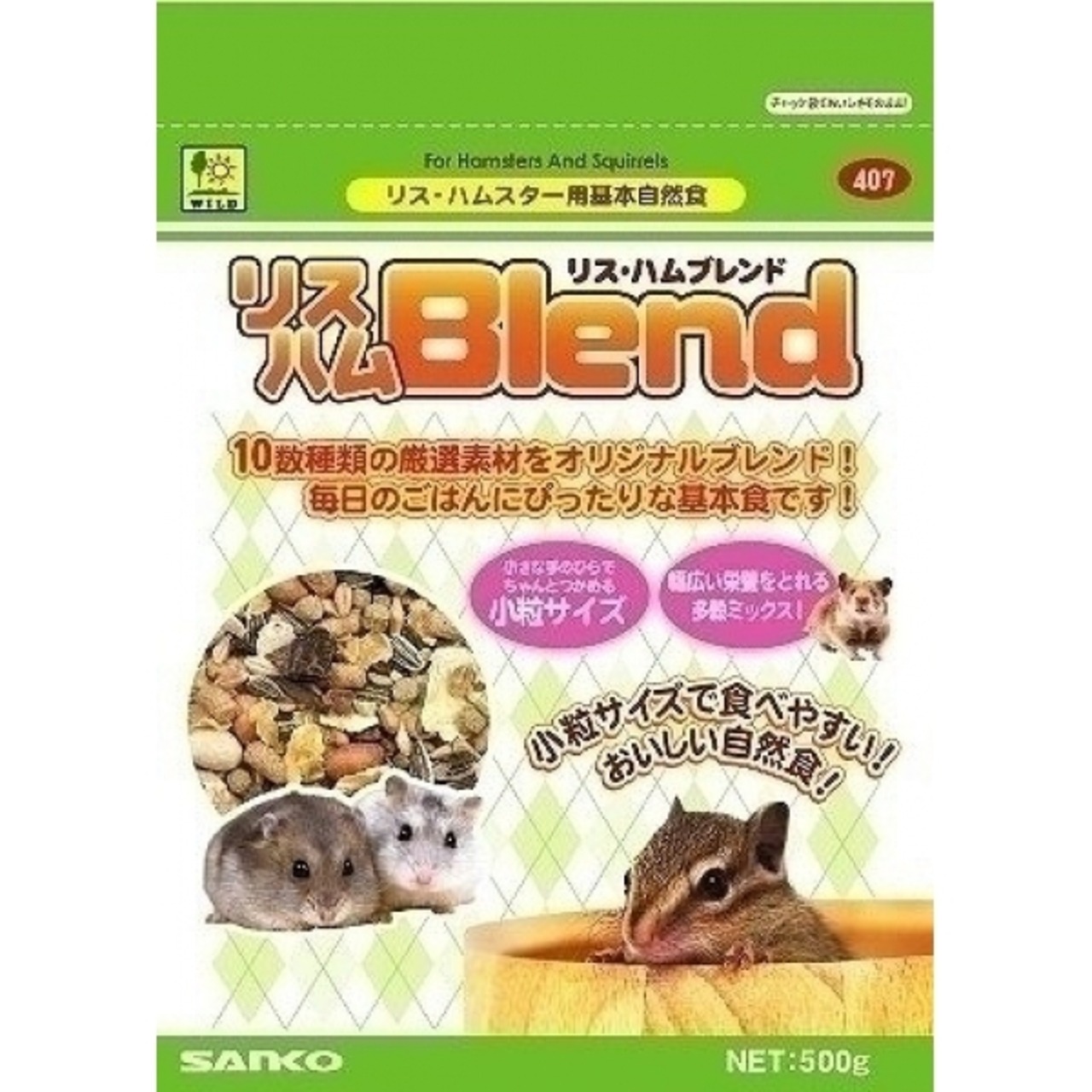 ヒマワリ、トウモロコシ、押し豆、小麦、ピーナッツ、大麦、そば、イナゴ豆、発泡キャロットなど10数種の厳選素材を使用。リスハムスターたちの成長や健康維持に必要な栄養を幅広く摂取できるバランスよくブレンドしたメインフード